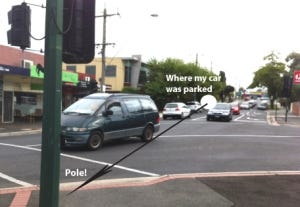 My car was about 50 metres (150 feet) down the road, drifting silently backwards into a very busy “T” intersection, tracking a perfect path toward a power pole on the other side. It wan’t travelling fast, a bit less than walking speed, but it was an odyssey promising disaster.